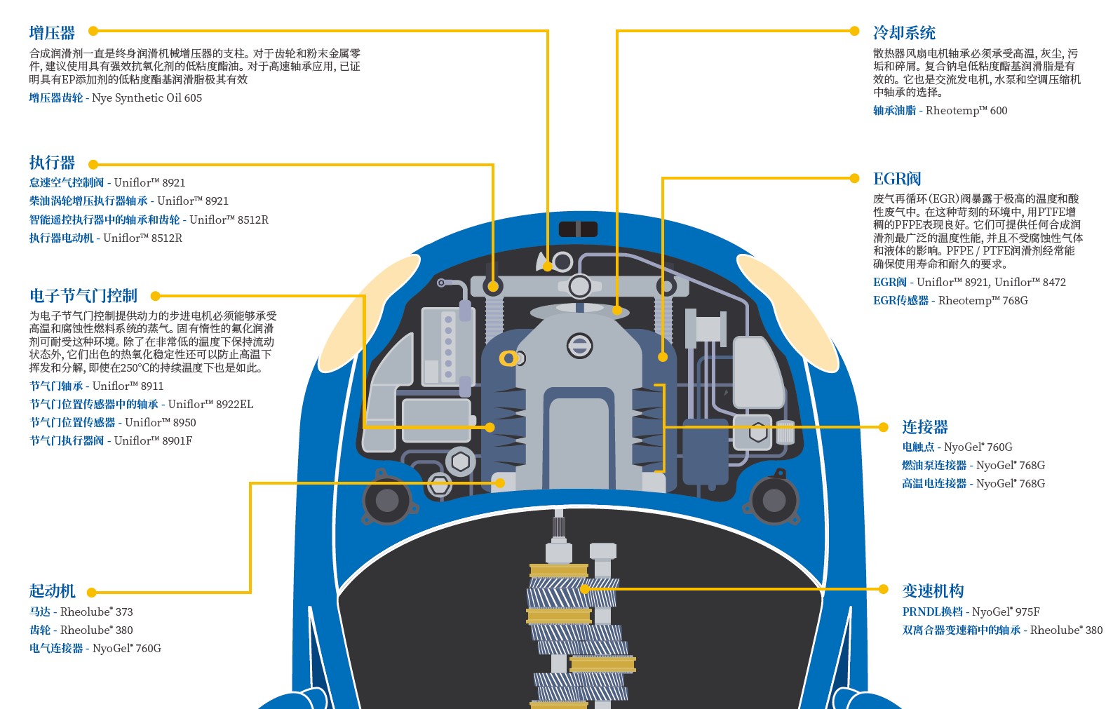 废气再循环(EGR)阀暴露于极高的温度和酸性废气中。 在这种苛刻的环境中,用PTFE增稠的PFPE表现良好。 它们可提供任何合成润滑剂最广泛的温度性能,并且不受腐蚀性气体和液体的影响。 PFPE / PTFE润滑剂经常能确保使用寿命和耐久的要求。